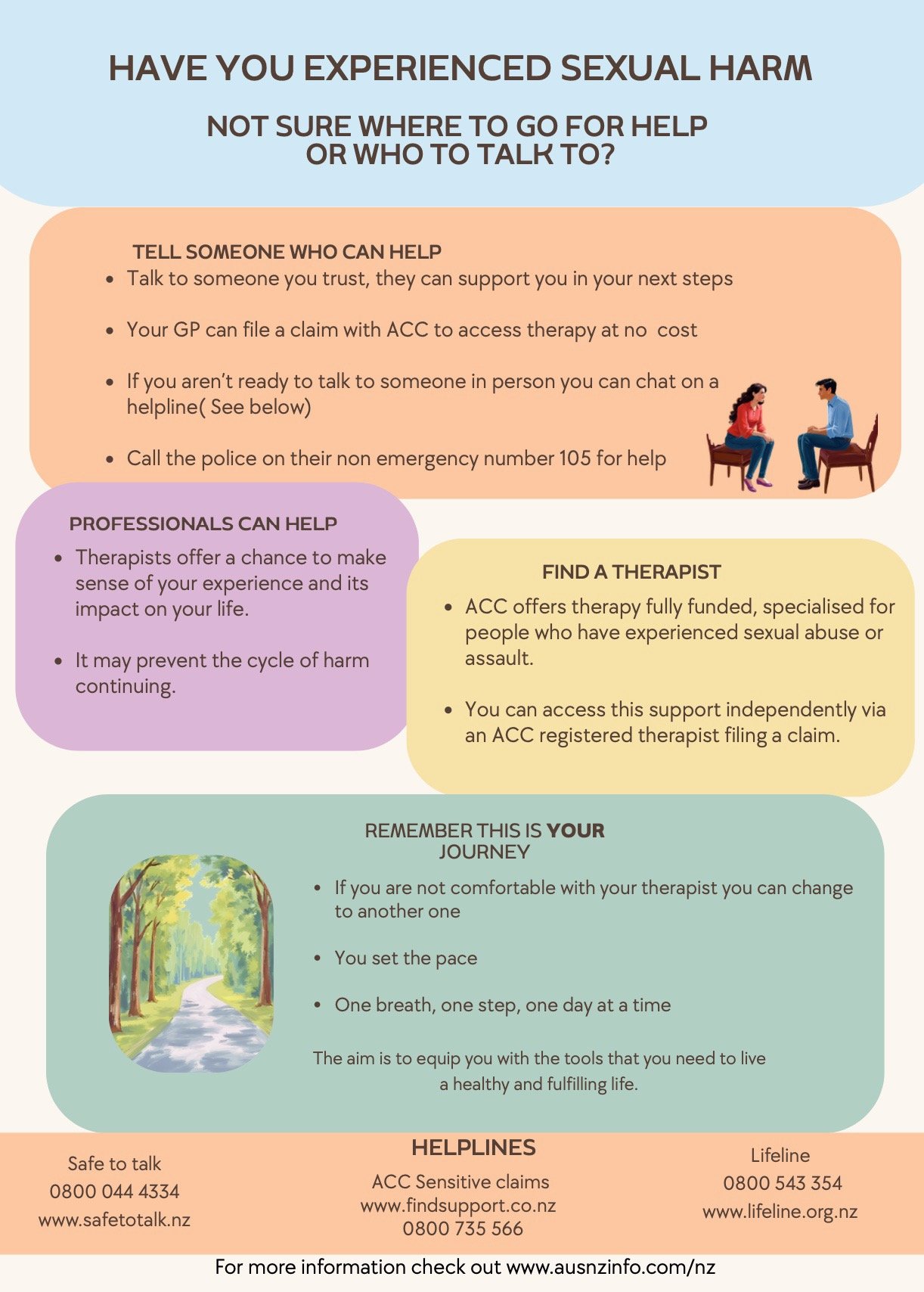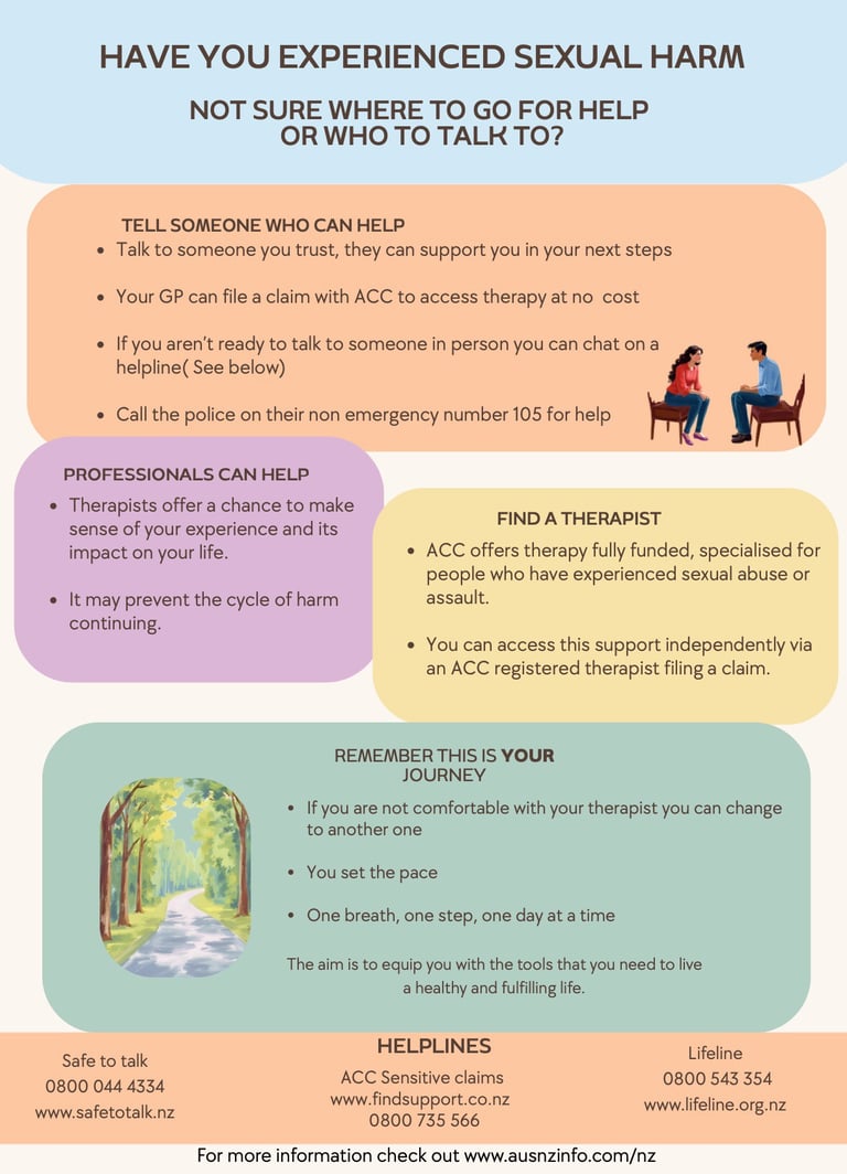 You don’t need to have everything figured out. Below are some support options on offer in New Zealand. Through ACC sensitive claims, you have access to specialised therapy. This means your healing journey can begin in a way that feels manageable and supported.
